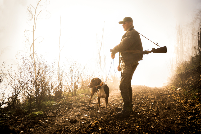 Hunter with rifle standing on gravel road and holding dog on a leash. Bright light is in the background.